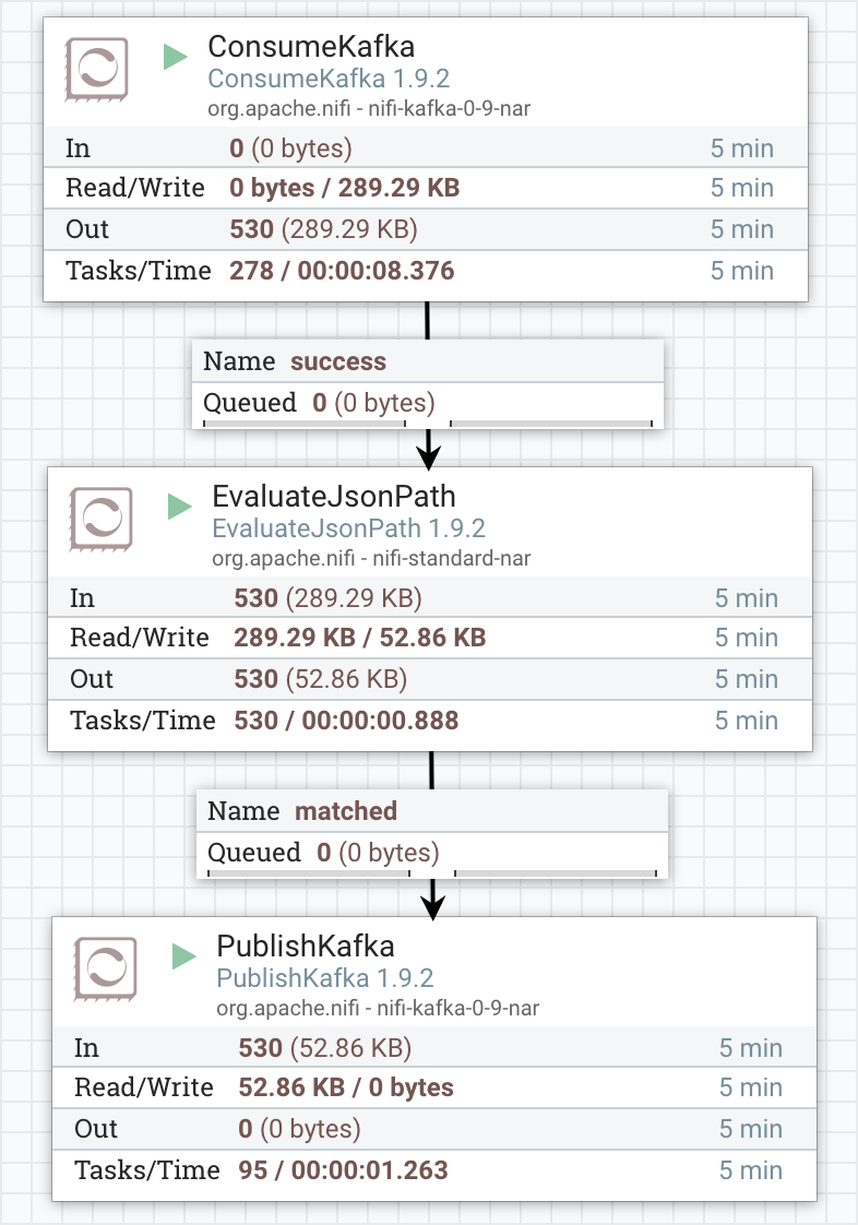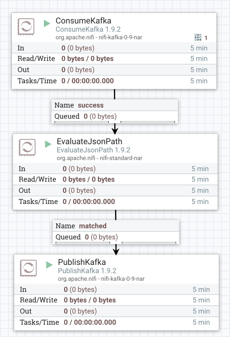 - 각 프로세서를 드래그해서 연결합니다. EvaulatedJsonPath에서 PublishKafka로 연결할 때의 관계는 matched로 설정합니다. (ConsumerKafka > EvaluateJsonPath > PublishKafka 순서)