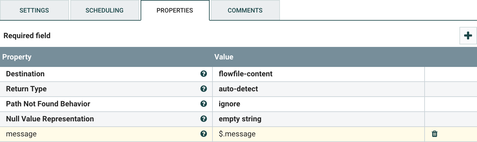 - EvaluateJsonPath 프로세서를 추가하고, PROPERTIES 탭에서 우측 더하기 버튼으로 아래 설정 값을 추가합니다.