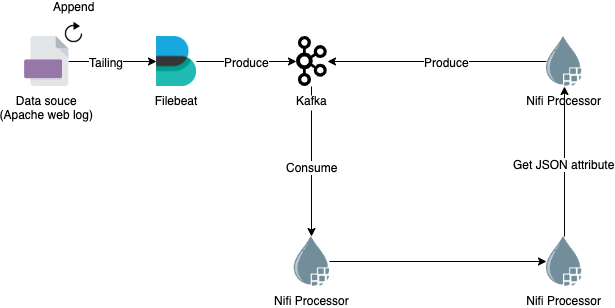 데이터는 Filebeat -> Kafka -> Nifi -> Kafka 순서로 흘러가는 구조입니다. 데이터 소스로 Apache 웹 로그를 사용해 실제 환경과 같이 일정 속도로 흘러가도록 구성하고, 실시간으로 데이터 스트림이 동작하는 모습을 확인해보겠습니다.
