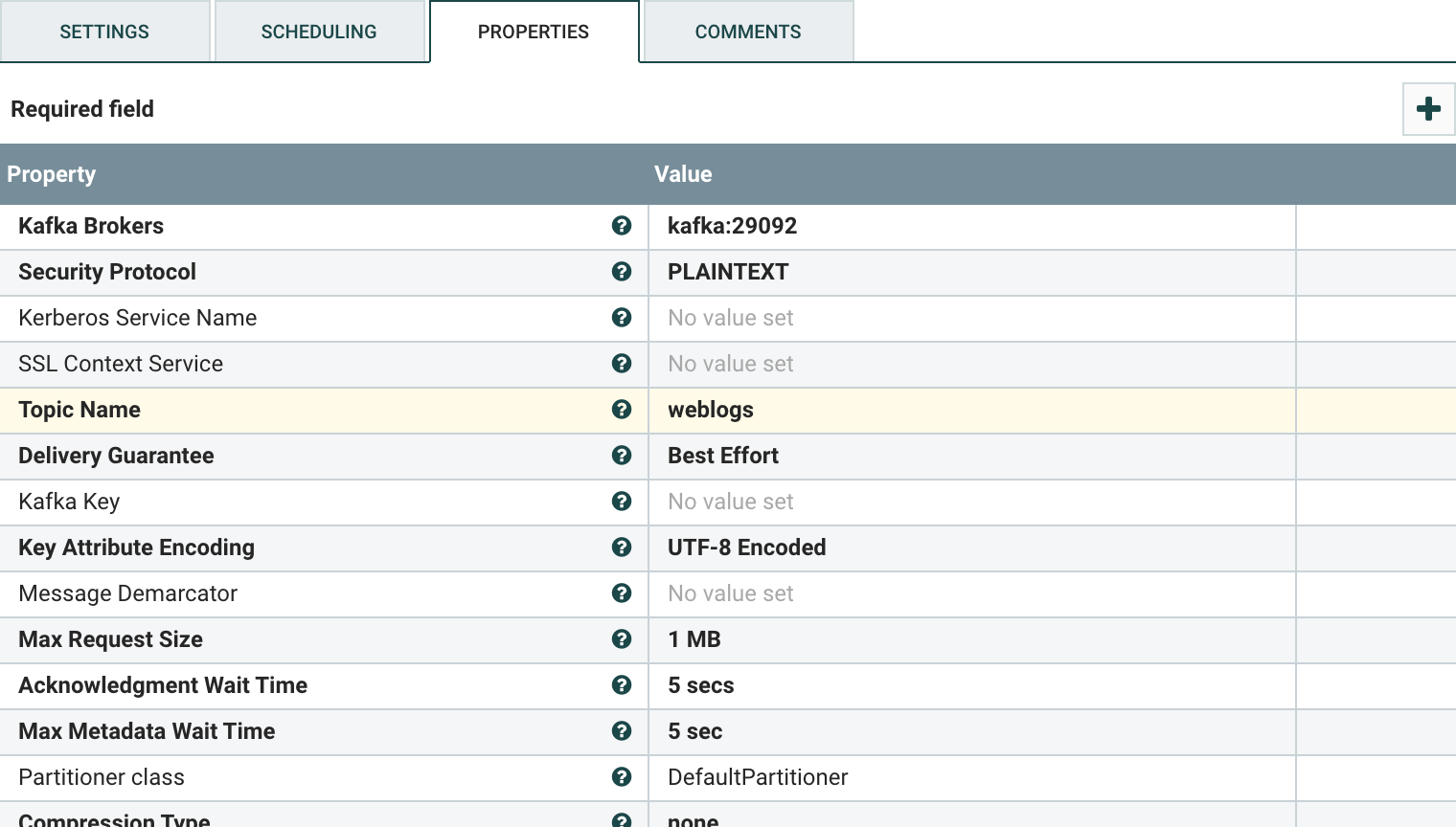 - PublishKafka 프로세서를 추가하고, PROPERTIES 탭의 설정 값을 아래와 같이 변경합니다.