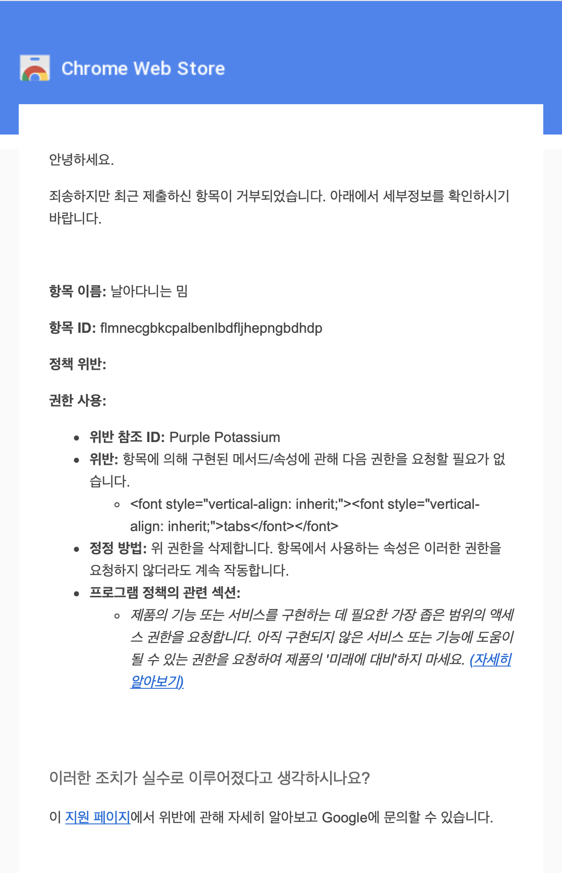이유는 사용하지 않는 tab 권한을 요청했다는 것인데, 제가 background.js 코드 내에서 사용한 chrome.tabs.* 때문에 tab 권한이 필요하다고 생각해서 넣은 것이 거절 이유였습니다. 이를 제거하고 다시 시도했더니 정상적으로 등록이 되었습니다.