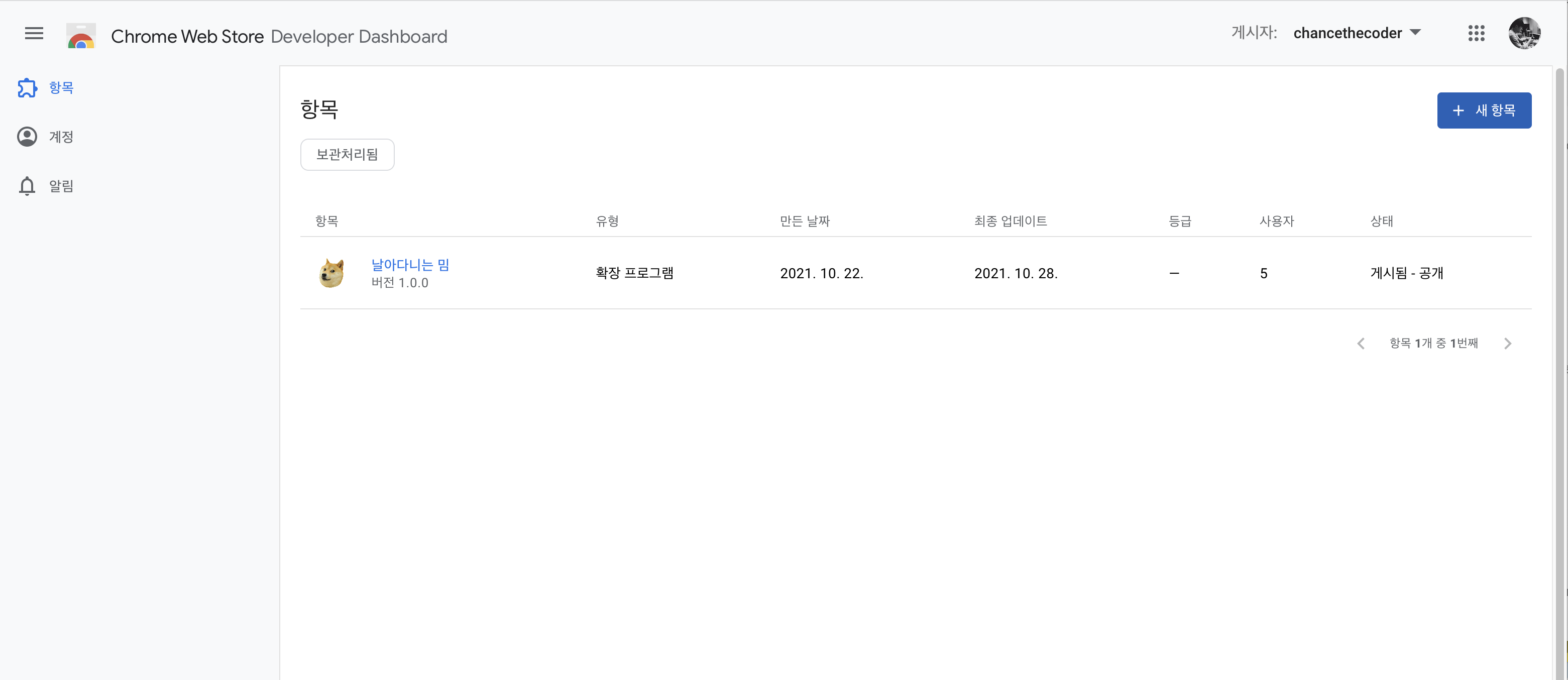 배포는 크롬 개발자 대시보드에서 진행할 수 있습니다. 처음에 5$의 수수료를 먼저 결제해야 하고, 결제가 완료되면 아래와 같은 대시보드를 확인할 수 있습니다.