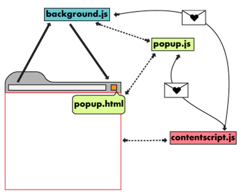 이제 구현을 하기 위해 크롬 확장 프로그램의 구조를 알아봐야 합니다. 이미 공식 문서에 내용은 잘 나와 있지만, 전부 영어이므로 한글로 간략하게 정리해보겠습니다. 프로젝트 내부의 주요 구성 요소는 아래와 같습니다.