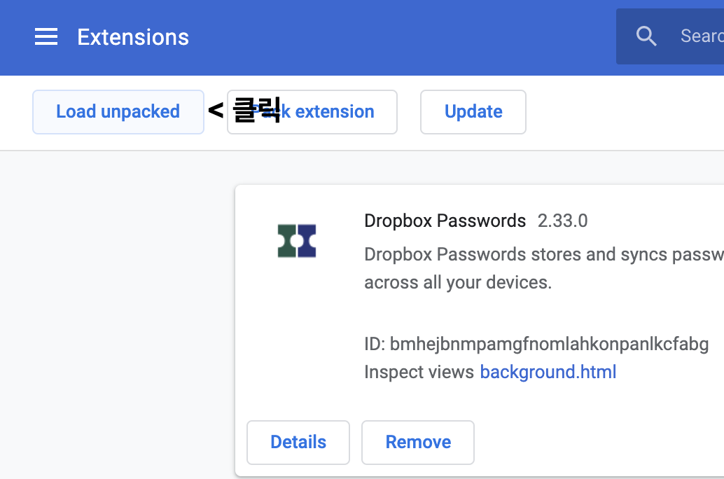 3. 좌상단 Load unpacked 클릭해서 업로드