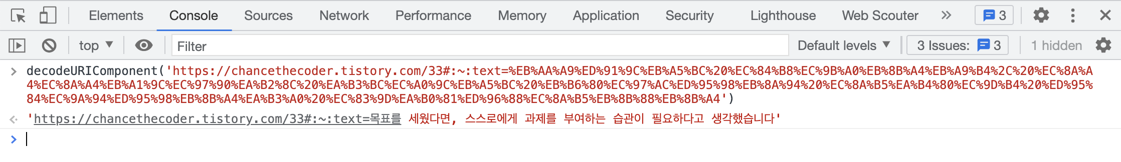 개발자 콘솔에서 디코딩을 통해 한글 포맷으로 변환해보겠습니다.