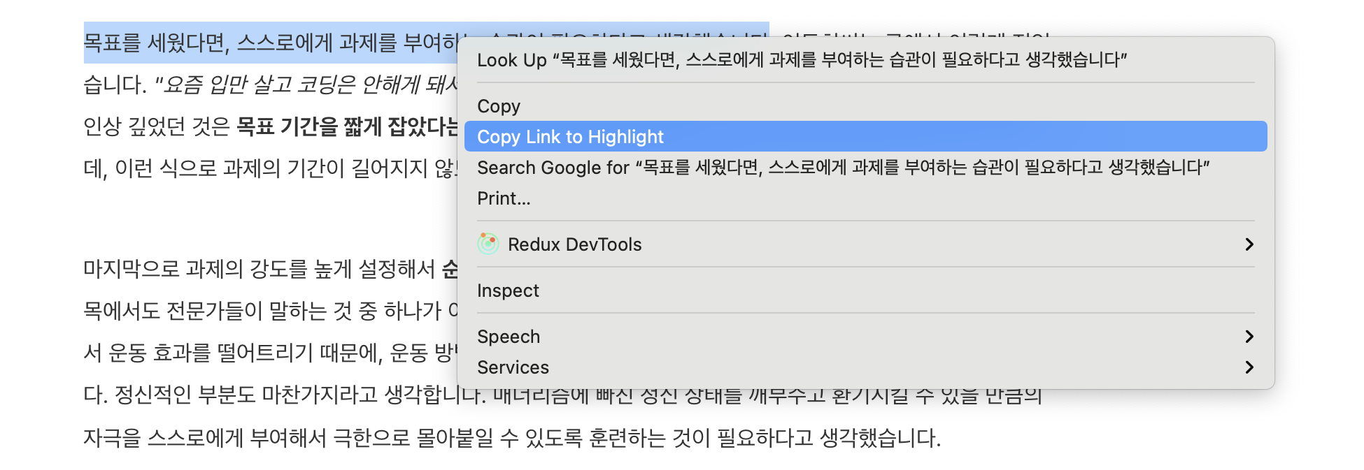 - 크롬 브라우저의 하이라이트 링크 복사하기는 Text Fragment를 통해 구현된 기능입니다.